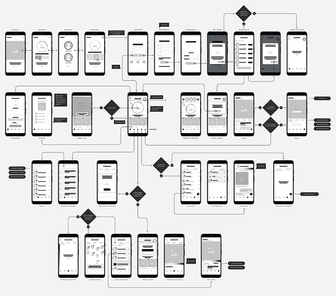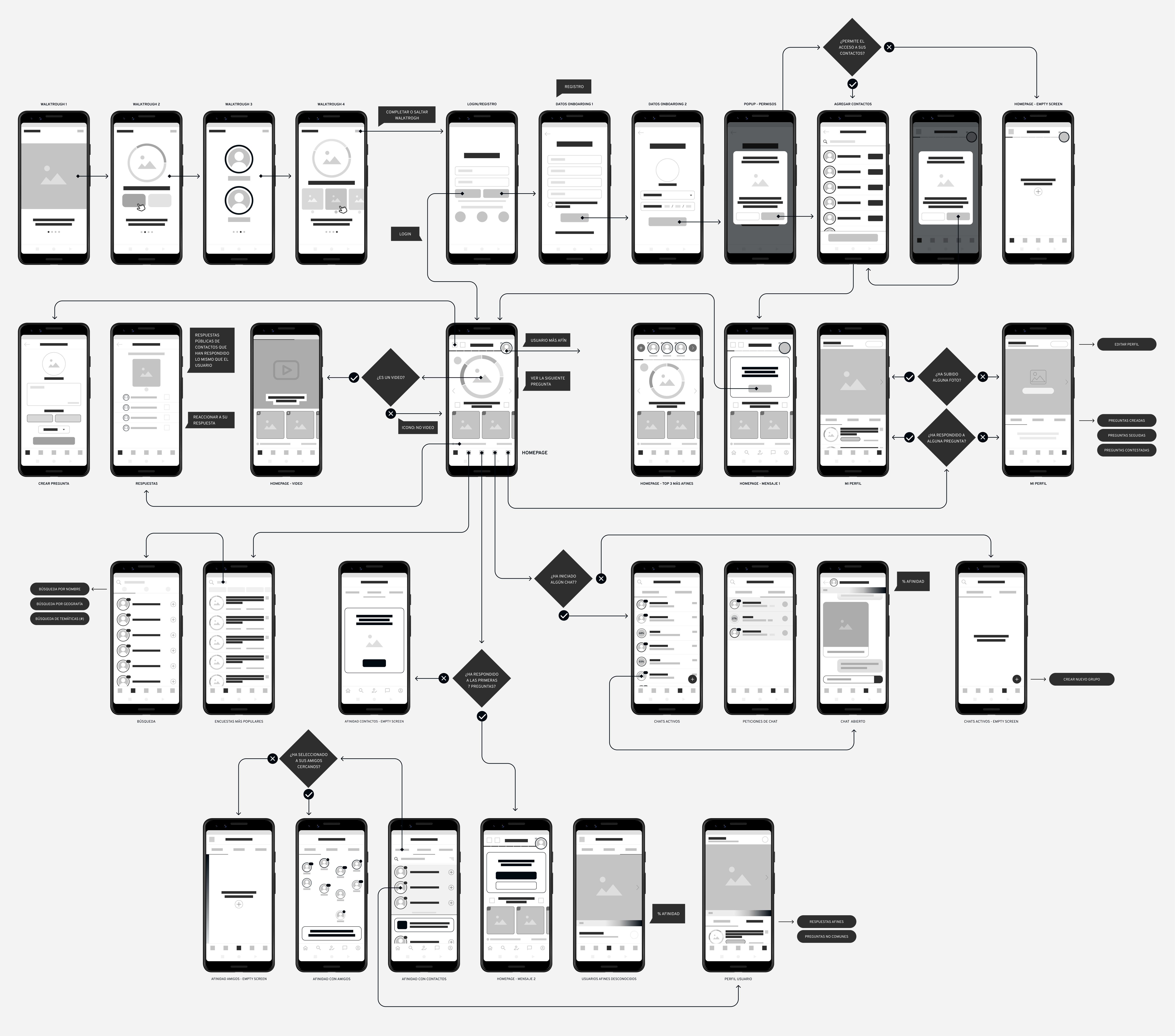 Para la organización completa del producto digital elaboré flujos de usuario utilizando los wireframes, al principio en MI-FI, y posteriormente en HI-FI.