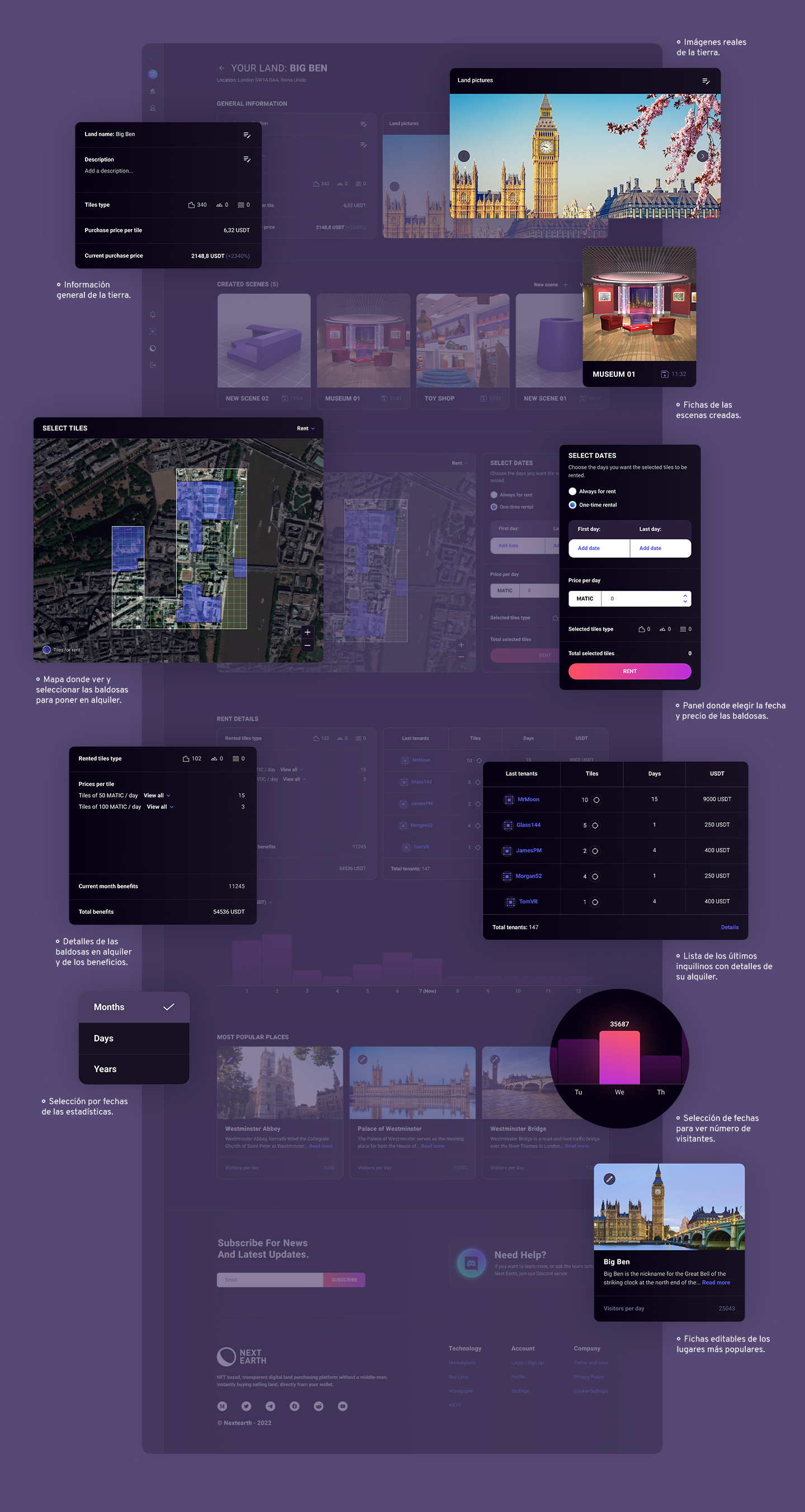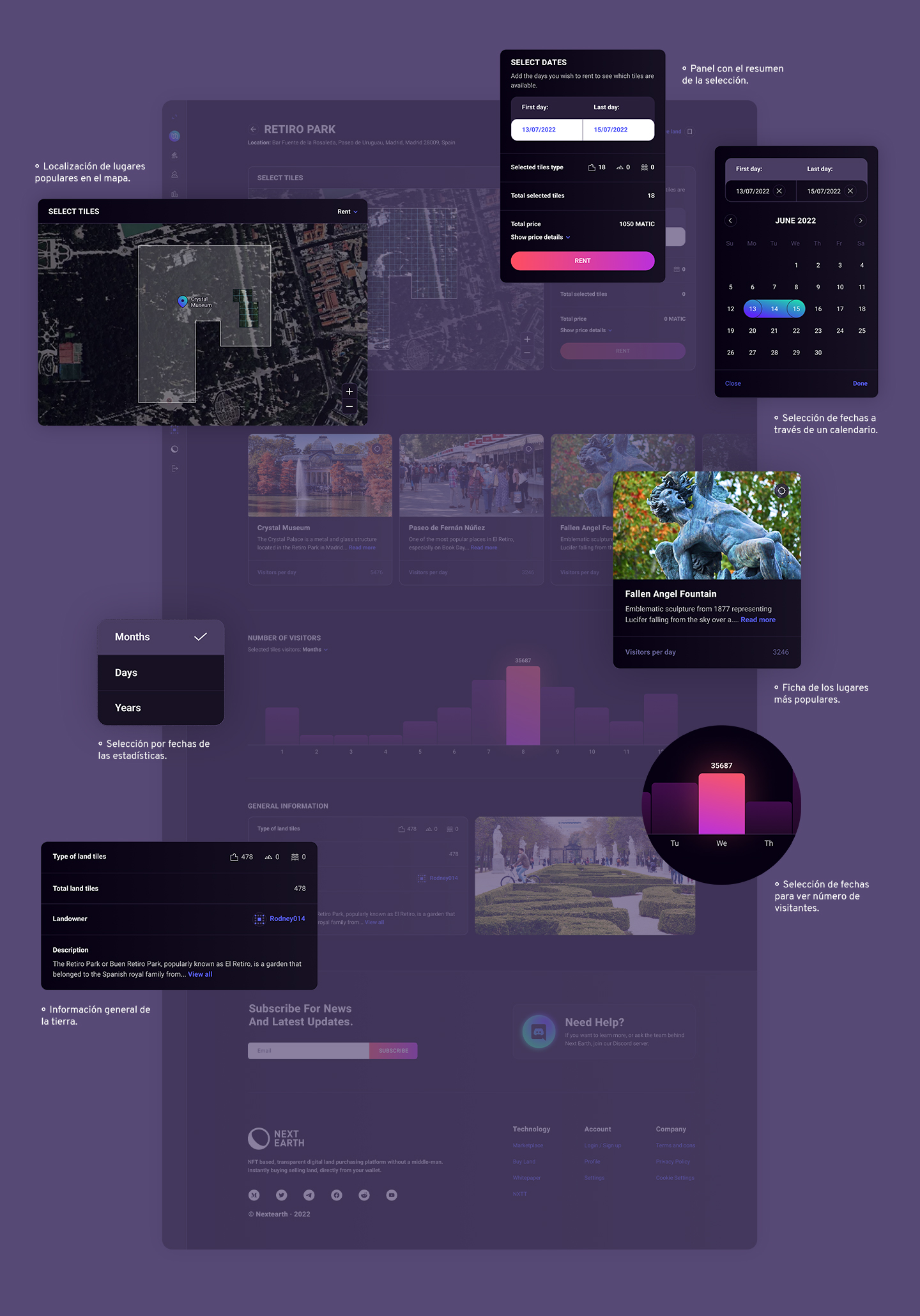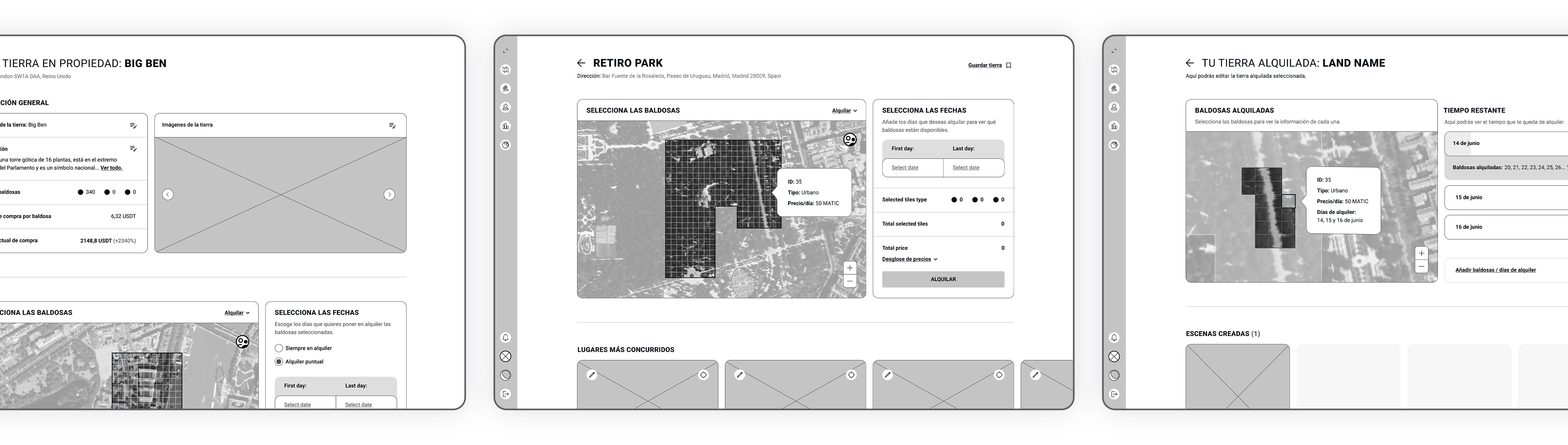 El perfil que podrán ver aquellos usuarios interesados en alquilar (e incluso comprar) una tierra en concreto. Encontrarán en él toda la información que necesitan y podrán elegir las fechas y las baldosas que quieren alquilar.