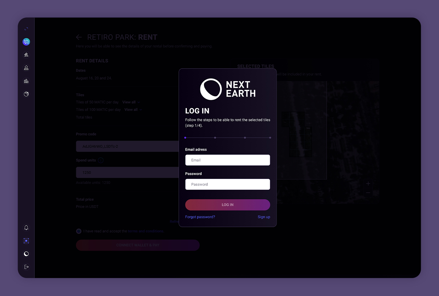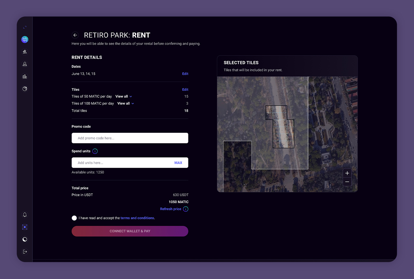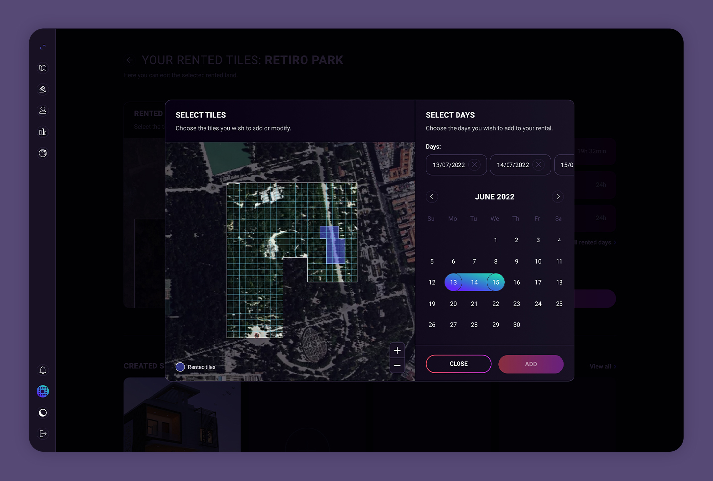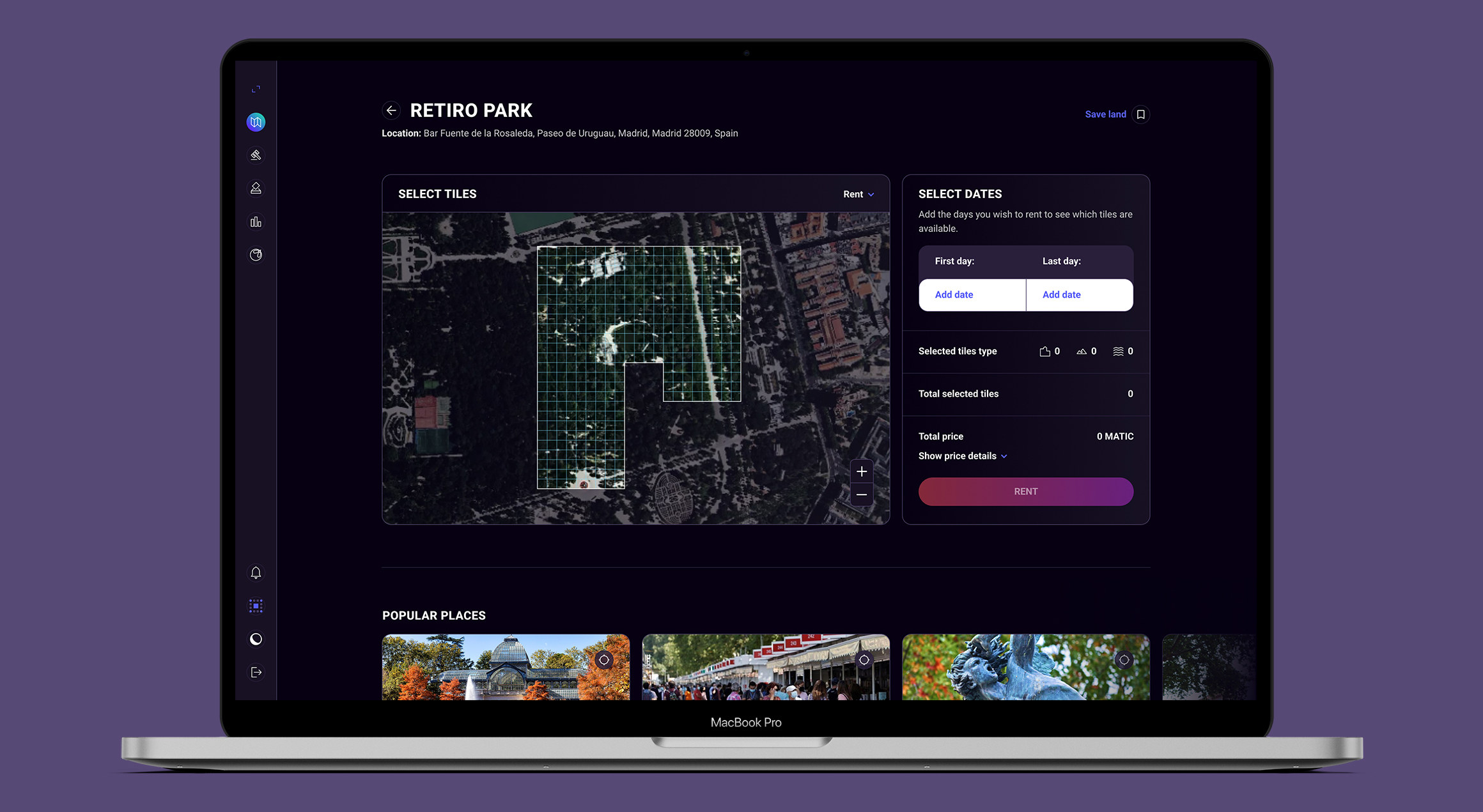 El perfil que podrán ver aquellos usuarios interesados en alquilar (e incluso comprar) una tierra en concreto. Encontrarán en él toda la información que necesitan y podrán elegir las fechas y las baldosas que quieren alquilar.