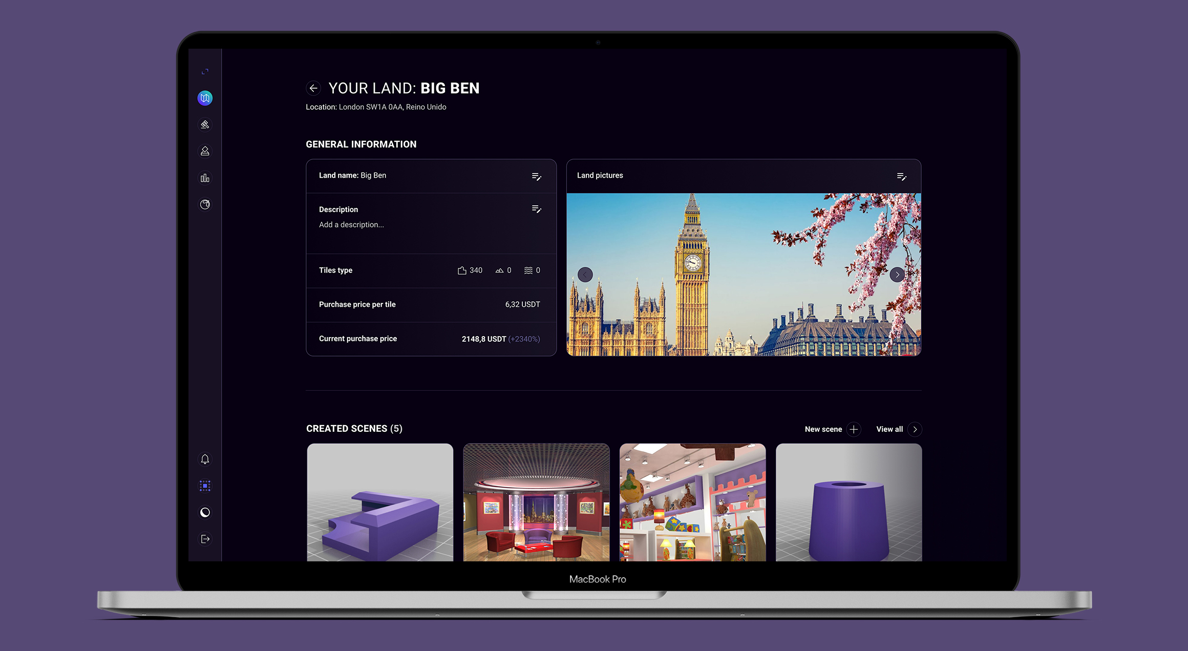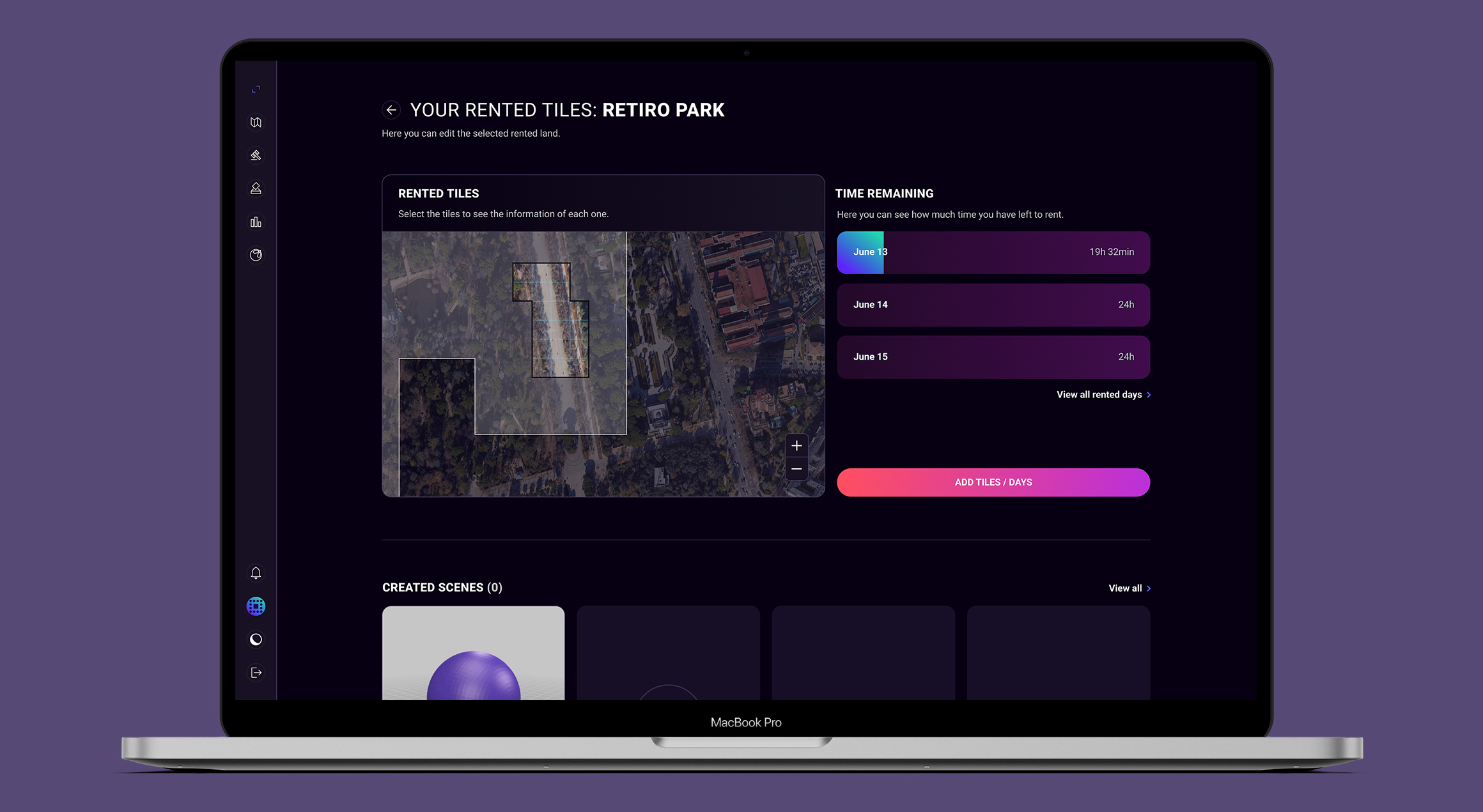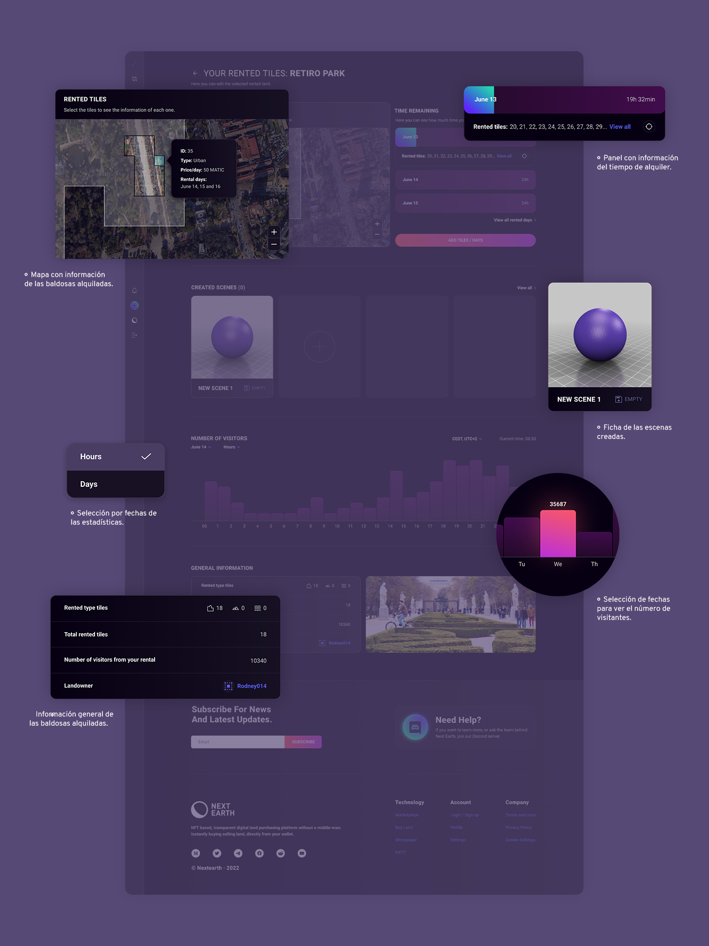 El perfil que podrán ver únicamente los usuarios que hayan alquilado esa tierra. En él podrán ver el tiempo que les queda de alquiler (así como añadir o modificar tanto las fechas como las baldosas) y, además, crear y modificar escenas.