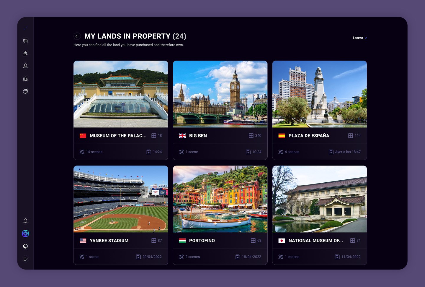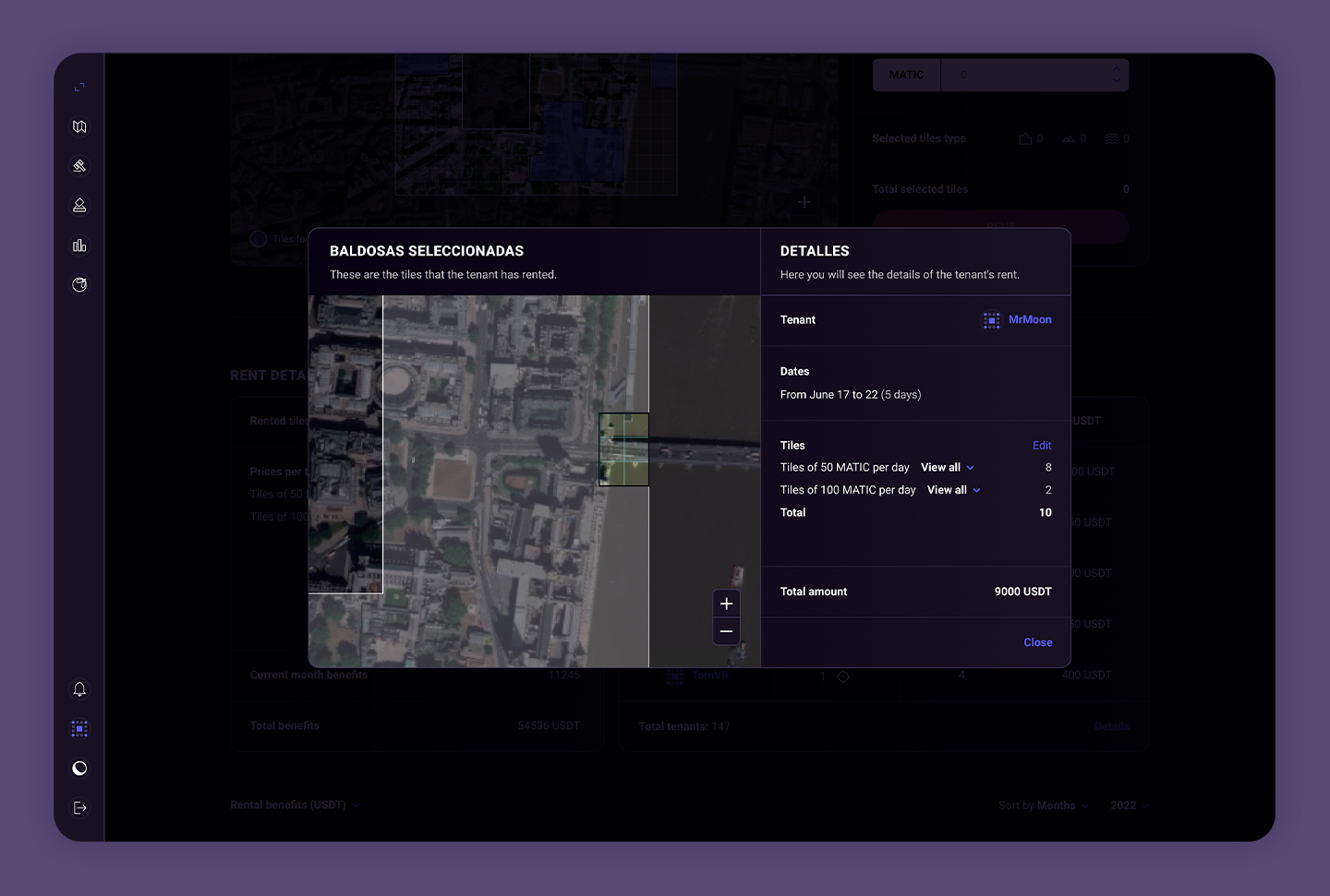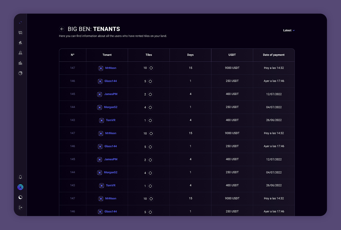 El perfil que podrán ver únicamente los usuarios que hayan alquilado esa tierra. En él podrán ver el tiempo que les queda de alquiler (así como añadir o modificar tanto las fechas como las baldosas) y, además, crear y modificar escenas.