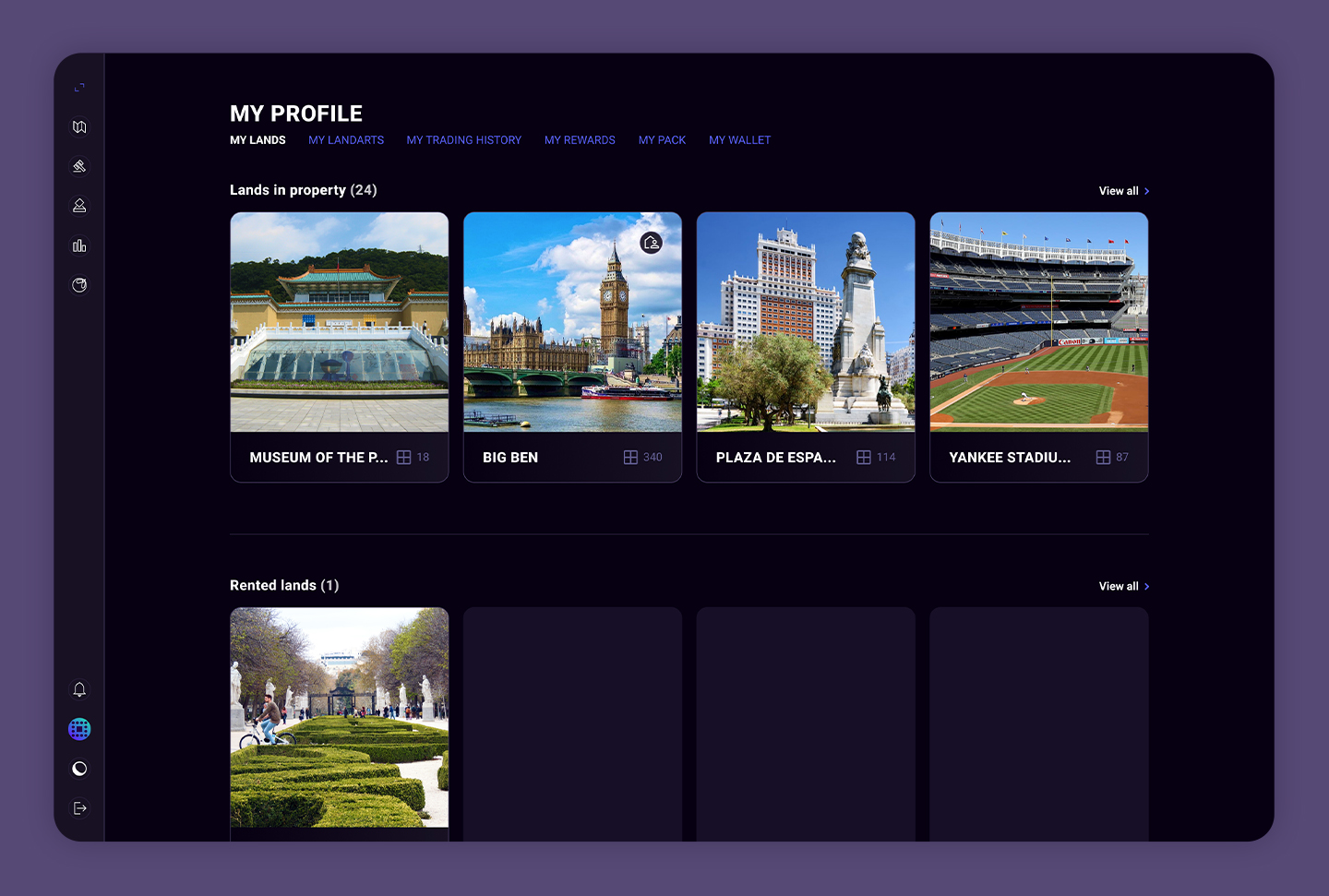 El perfil que podrán ver únicamente los propietarios de la tierra. En él podrán editar el nombre, la descripción y las imágenes principales, así como añadir o modificar las fichas de los lugares más concurridos. También podrán poner las baldosas que seleccionen en alquiler, ver los beneficios y los datos de los inquilinos, así como crear y modificar escenas.