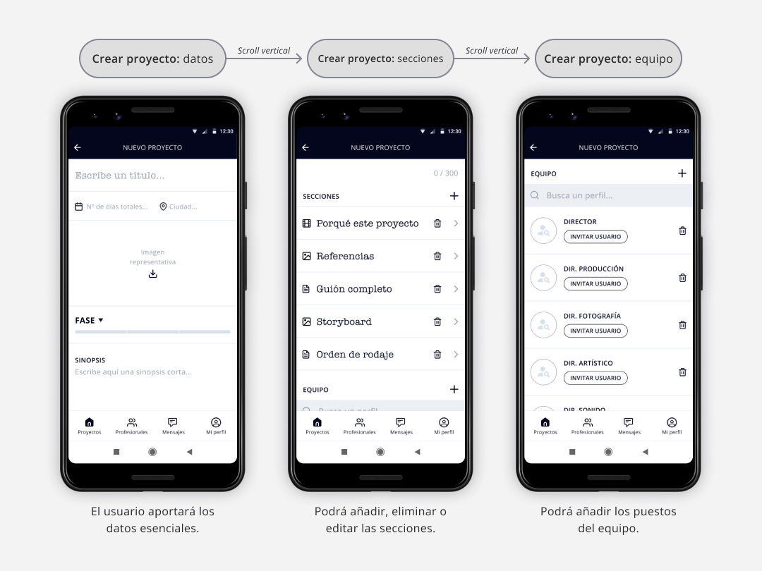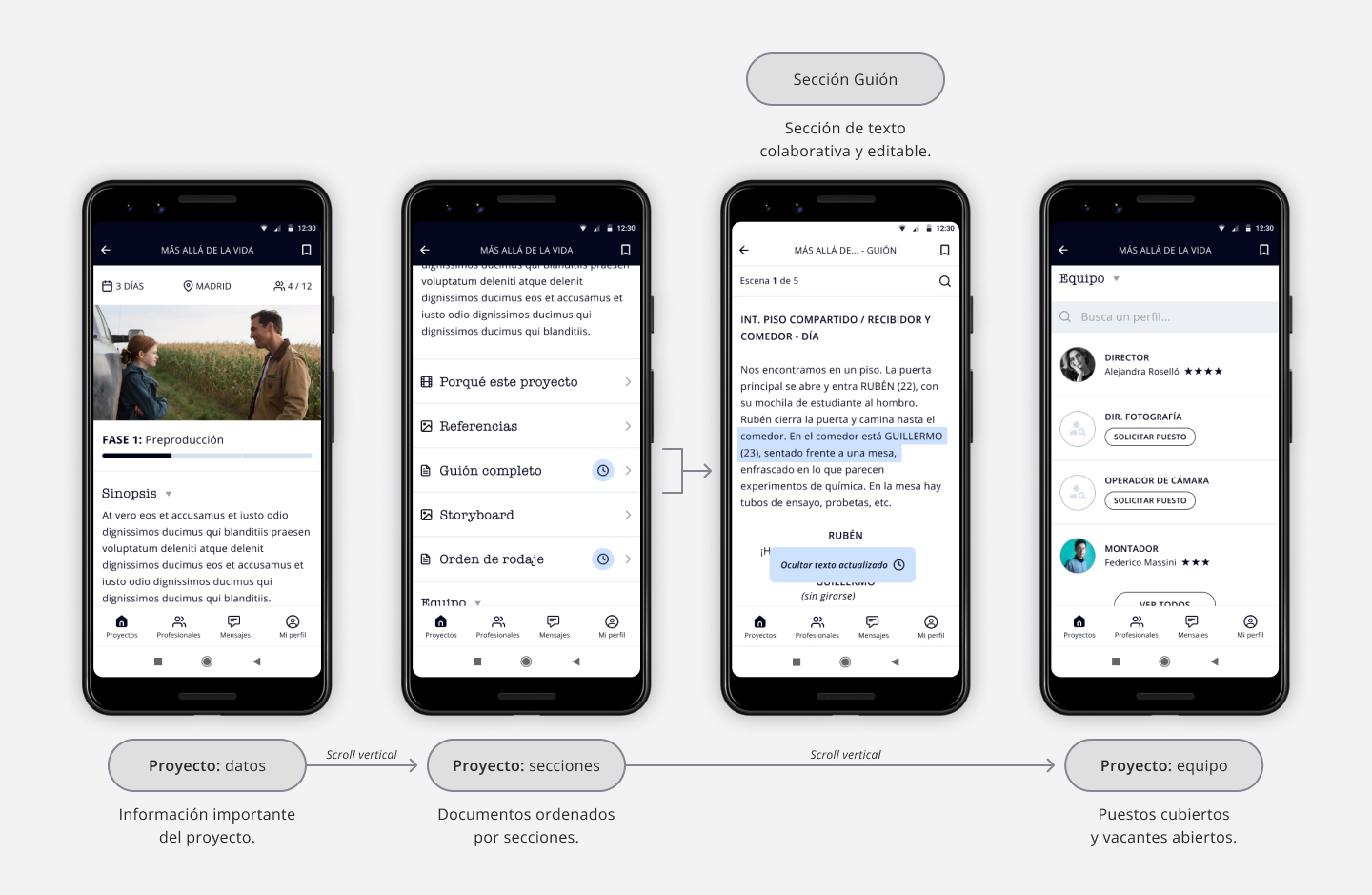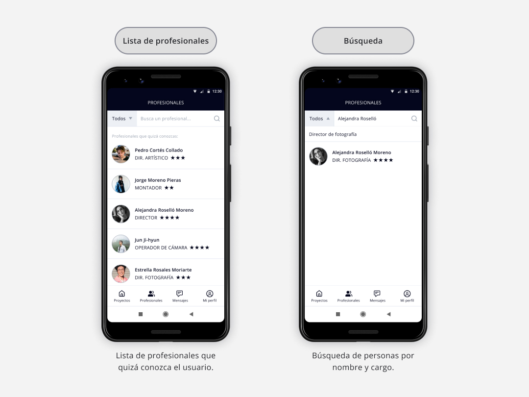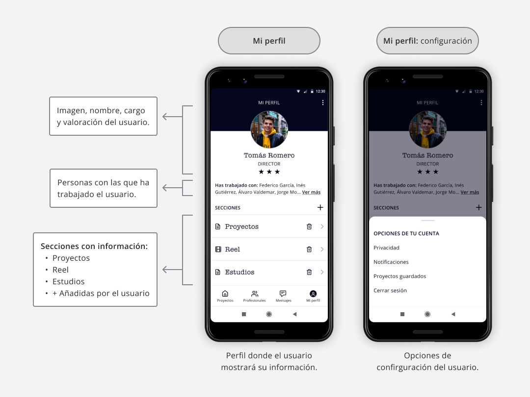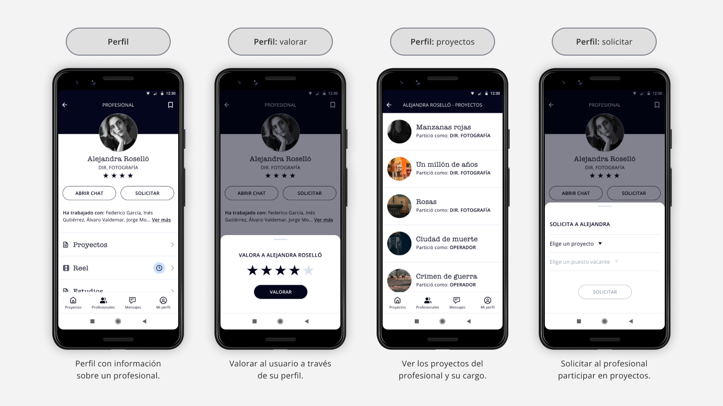 A través del perfil de un profesional, el usuario podrá obtener información (acceder a los proyectos en los que ha participado, a su «reel» actual, a sus estudios y a aquella información que el usuario haya publicado sobre sí mismo), así como iniciar una conversación o solicitar al profesional para su proyecto.