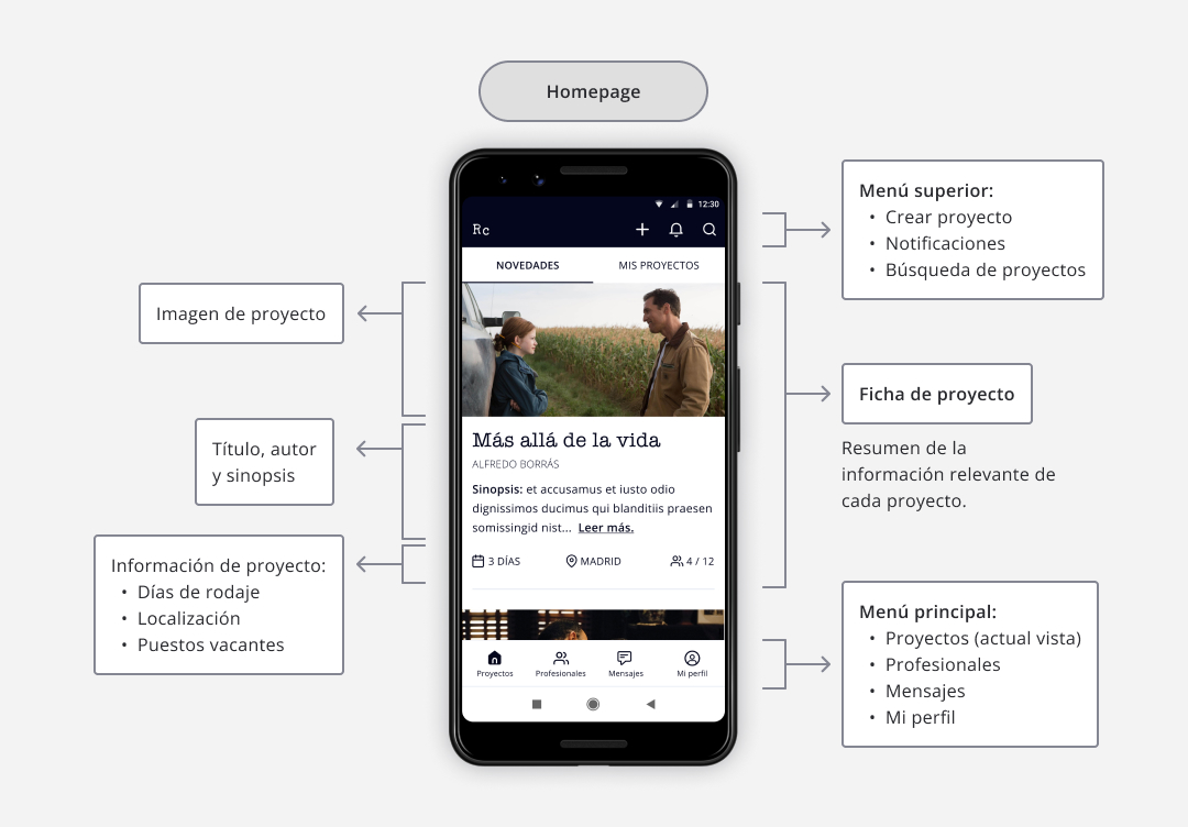 A través de la Homepage, el usuario también podrá crear un proyecto propio, revisar sus notificaciones y buscar proyectos.