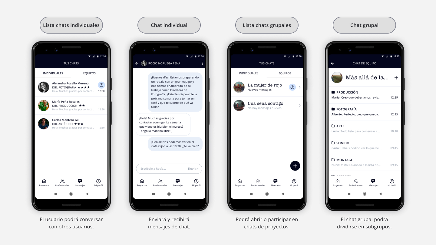 Los usuarios podrán conversar mendiante «chats» individuales pero también, y obedeciendo a las necesidades propias de la organización de un proyecto audiovisual, podrán hacerlo mediante un «chat grupal» donde encontrarán los diferentes subgrupos de cada departamento. De esta forma, la comunicación del equipo estaría organizada según el cargo que ocupa cada miembro.