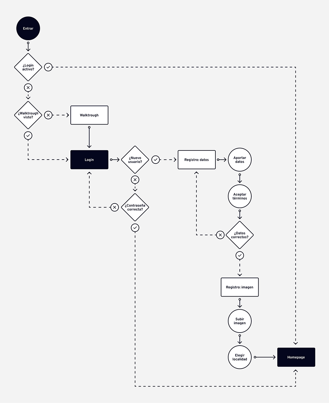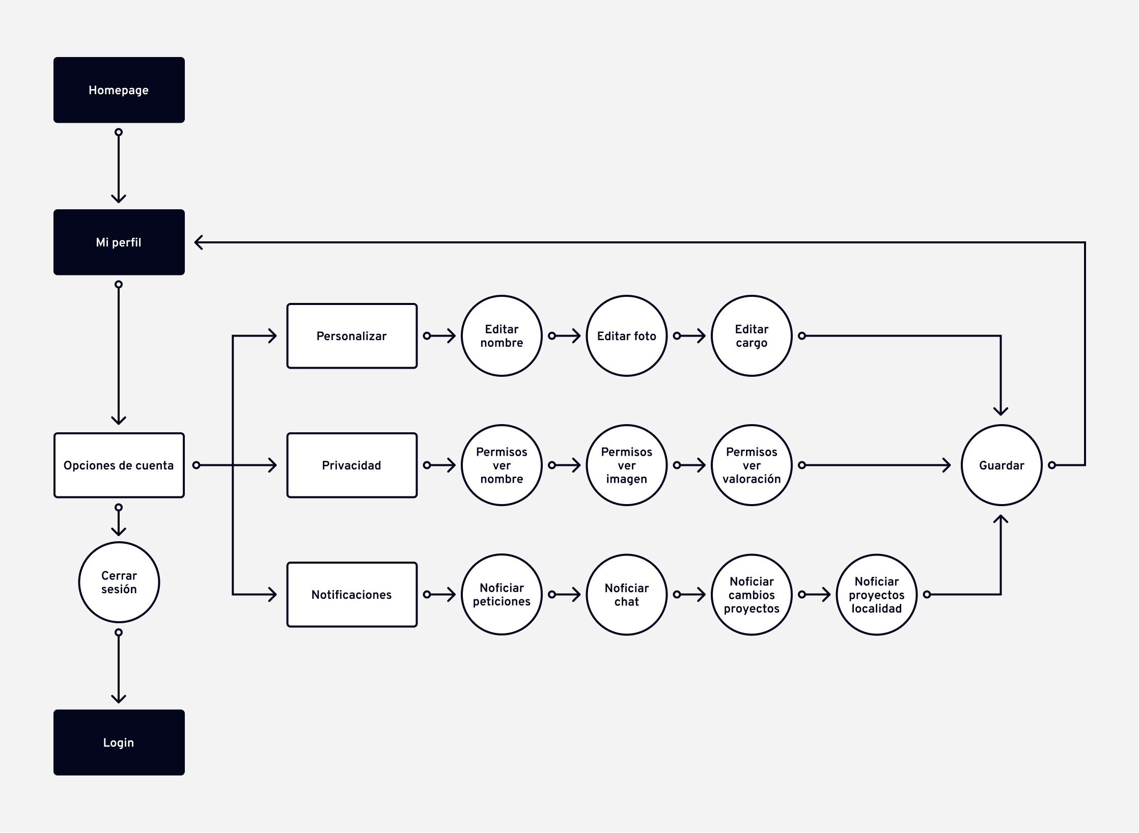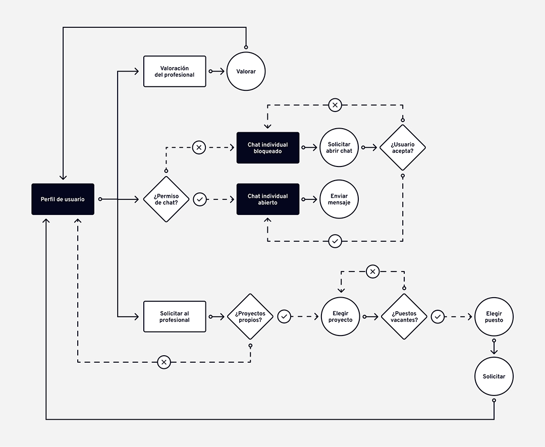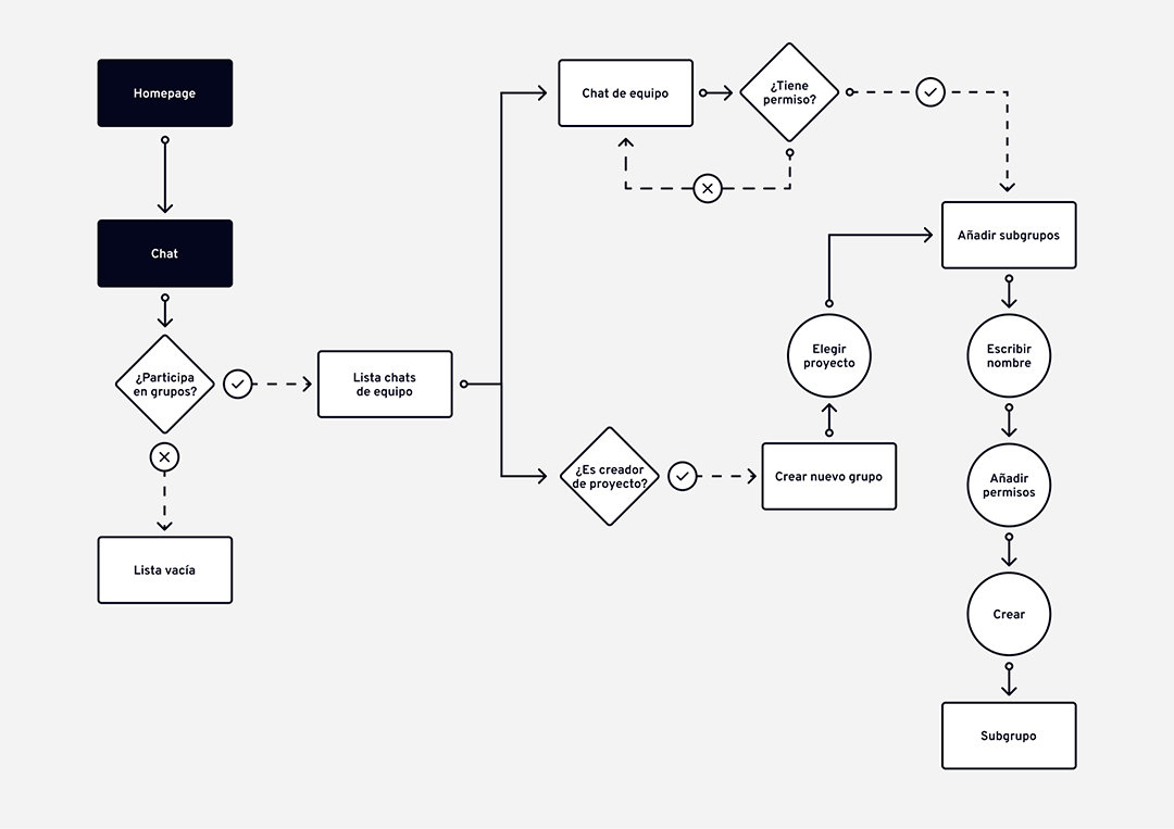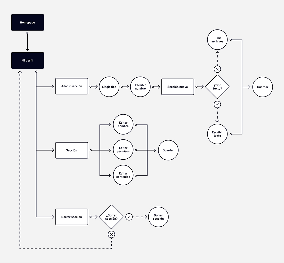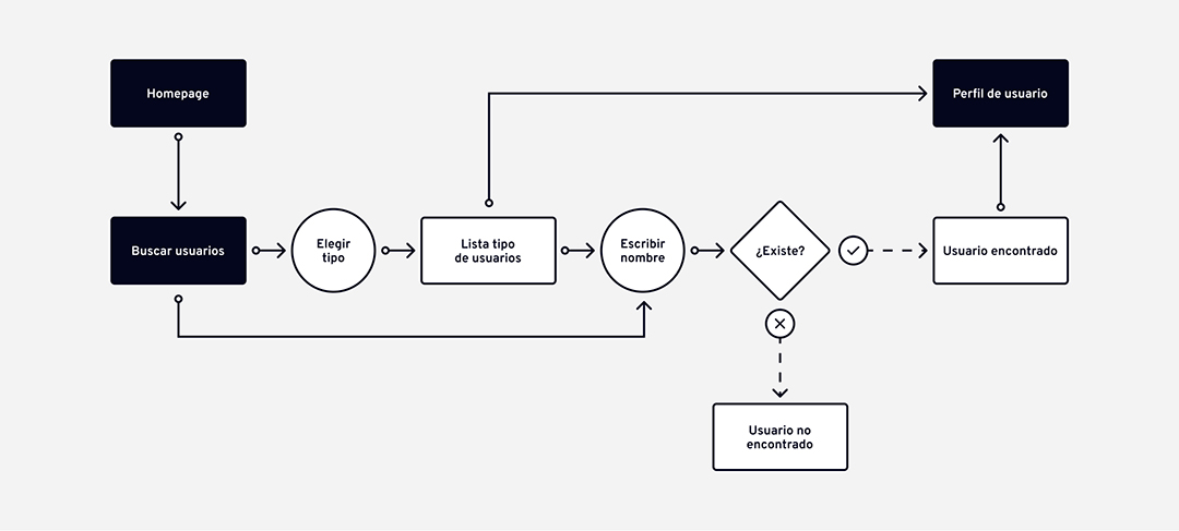 Para organizar todas las funcionalidades del producto digital, fue imprescindible realizar, previamente a la fase de diseño, los siguientes flujos de usuario.