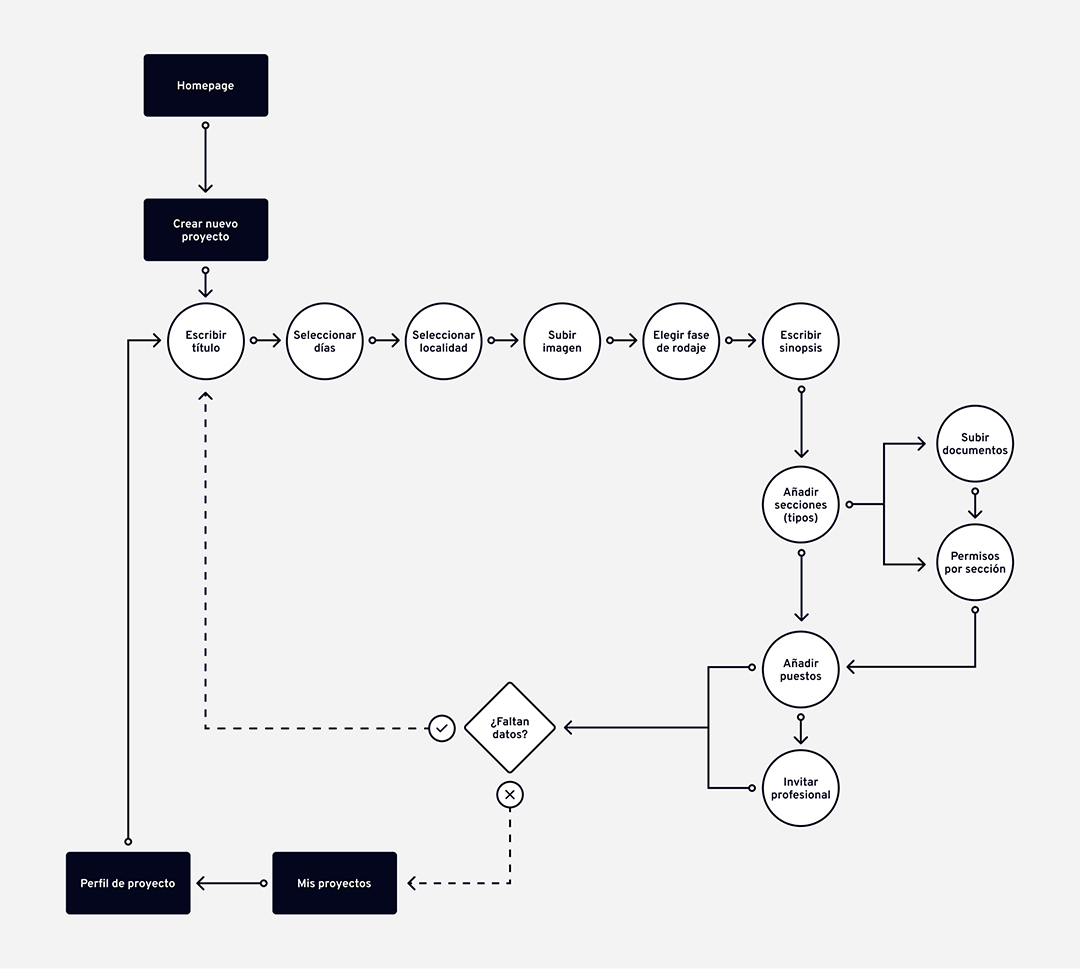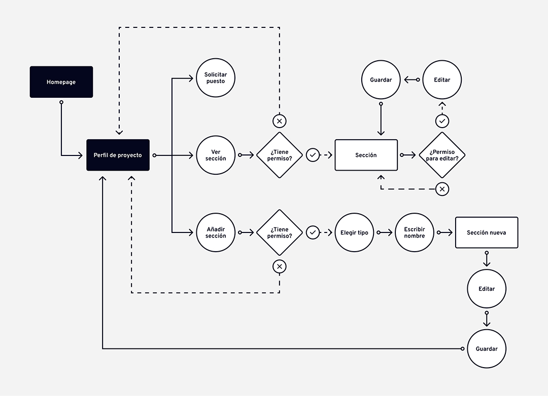 Las funcionalidades principales del usuario en la Homepage serán tanto la creación de proyectos como la revisión de los mismos. El usuario creador, en el siguiente flujo de usuario, podrá crear un proyecto y publicarlo de una forma sencilla, así como editar las secciones informativas y sus permisos.